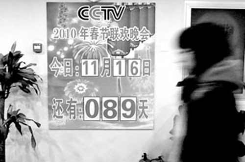 這個(gè)由紅色燈籠、黃紅相見的煙花裝扮的倒計(jì)時(shí)牌,格外喜慶。昨天,倒計(jì)時(shí)牌上顯示“CCTV2010年春節(jié)聯(lián)歡晚會(huì)今日:11月16日 還有:089天”。
