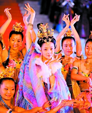 在《楊貴妃秘史》的拍攝基地,記者們首次看到了該劇剛剛制作完成的40分鐘片段。在片花中,演員們?nèi)A麗的服飾十分搶眼,“霓裳羽衣舞”也得到了完整展示,尤小剛表示,片中的舞蹈段落非常多,全劇拍攝的4個月中,舞蹈團隊就跟了三個半月,“大家都以為拍古裝戲,打仗的場面最難拍,其實不然。拍攝這部劇最難的是在復原很多鮮為人知的唐朝文化細節(jié)。觀眾在這部劇中可以看到數(shù)百人組成的唐代宮廷樂隊,黃秋生扮演的李隆基也表演了好幾段舞蹈!