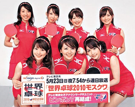 中新網(wǎng)4月19日電 日本東京電視臺(tái)去年轉(zhuǎn)播橫濱世界乒乓球賽,讓一批美女主播組成“乒乓 7”組合報(bào)道賽事,結(jié)果收視創(chuàng)下同類體育節(jié)目新高。世界乒乓球賽下月 23日在莫斯科開(kāi)打,東京電視臺(tái)決定重召“乒乓”,眾美女主播更以火辣辣超短紅裙亮相拼收視。