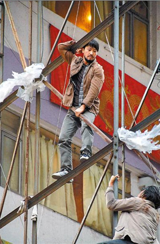 臺灣媒體消息,黎明前天在銅鑼灣鬧市區(qū)拍攝一場驚險(xiǎn)追逐的戲,現(xiàn)場只見黎明在5層樓高的鷹架上爬來爬去,看得叫人為他捏把冷汗。