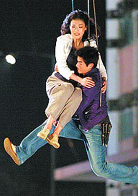 為了吊鋼絲的驚險戲碼,電影公司貼心為城城、舒淇安排替身,但2人大部分仍敬業(yè)親自上陣,為求安全,拍攝前都戴上護(hù)具做好安全措施,并試戲2、3次才正式開拍,過程大都安全順利。