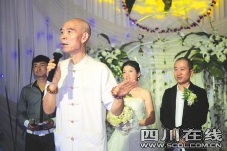 12點(diǎn)09分,婚禮正式開始,巴蜀笑星叮當(dāng)和朱軍聯(lián)袂主持。在6個“花仙子”的迎接下,李彧挽著陳燕琳,踏上紅色地毯,整個婚禮過程與傳統(tǒng)婚禮并沒有太大差別。叮當(dāng)宣布:“有請李伯清主婚登臺!”臺下300人立即爆出掌聲一片。李伯清登臺,依舊是他那詼諧、幽默的風(fēng)格,面對觀眾妙語如珠,他說:“之所以由我主婚,是因?yàn)槔畋L飵啄昵霸诔啥寂臄z《王保長新篇》,他用了我的許多學(xué)生,演了很多角色。還教育我的學(xué)生怎樣做人。今天他兒子娶了四川姑娘,這就是說,李保田一家人,看得起我們四川人!”李伯清主婚,不改插科打諢的特長。宣稱自己就是李彧和陳燕琳的父母,將來有什么事找他就是了,引來現(xiàn)場笑聲不斷。
