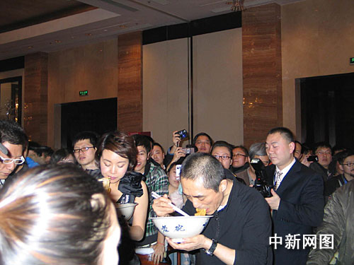在《三槍》中,“高桌子低板凳都是木頭”的陜西話地道風(fēng)趣,熱氣騰騰的油潑面更讓中國(guó)各地觀眾頓生興趣。很多觀眾看完 《三槍》,第一感覺就是想來一碗熱辣辣的油潑面。影片結(jié)尾,所有人復(fù)活,一起狂吃油潑面,場(chǎng)面壯觀。而今天,張藝謀、孫紅雷、閆妮、小沈陽、倪大紅等主創(chuàng)也當(dāng)眾“秀”了一把陜西油潑面。如《三槍》中的歌詞所唱:“吃碗油潑面,我保準(zhǔn)就能啪啪地沖鋒向前”。