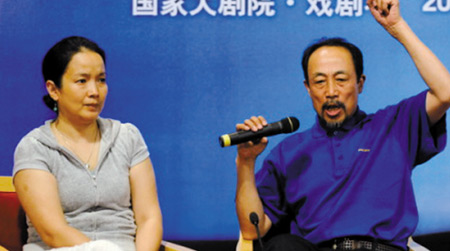 最激動的是飾演主角“培爾”的孫海英,打扮隨意的他剛拿起話筒時語調(diào)十分平靜,還被一旁的老伴呂麗萍調(diào)侃“說話像領(lǐng)導”。但談到演《培爾·金特》的感受,他的語調(diào)頓時激動起來,更大嘆“話劇已死”:“現(xiàn)在的戲劇都是在作假,互相說假話。人們都太浮躁,明明看不懂我們這部戲,只是看個熱鬧,到半場就回家了,還愣說看得懂———你明白個屁呀!什么都不明白!藝術(shù)不是因為你懂才來的,是因為不懂才來的,看不懂你就得學!我們不需要迎合大眾,你愛來不來!