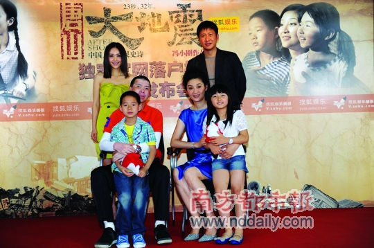昨日,即將于7月22日在內(nèi)地、香港、臺(tái)灣同步上映的《唐山大地震》在搜狐網(wǎng)開(kāi)通了電影官方網(wǎng)站,導(dǎo)演馮小剛攜主演徐帆、張國(guó)強(qiáng)等出席發(fā)布會(huì)與網(wǎng)友一同分享了他們關(guān)于30年前的記憶,并首度向外界公布了影片中“張國(guó)強(qiáng)、徐帆一家”的全家福照片。而在隨后的采訪中,馮小剛則否認(rèn)了徐帆因?yàn)槭亲约浩拮硬诺靡猿鲅荨洞蟮卣稹返膫髀劊靶旆乃皆谀莾簲[著,她撐起了這部電影的魂!蓖瑫r(shí),對(duì)于影片的票房,馮小剛再次放出豪言,“誰(shuí)不服,就和《大地震》同天上映!”