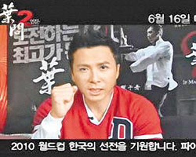 臺(tái)灣《中國(guó)時(shí)報(bào)》消息稱,《葉問2》遠(yuǎn)征韓國(guó),甄子丹正在拍《關(guān)云長(zhǎng)》無法前往,因此錄了約2分鐘的短片向韓國(guó)觀眾問好。他以韓文打招呼,接著說:“韓國(guó)是亞洲足球強(qiáng)國(guó),希望韓國(guó)隊(duì)在本屆世界杯有優(yōu)秀表現(xiàn)!彼說自己是曼聯(lián)隊(duì)韓國(guó)選手樸智星的球迷。