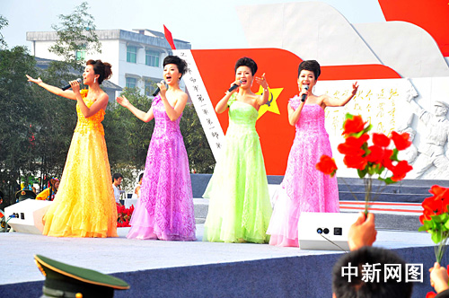中新網(wǎng)銅鼓9月3日電(段長征 劉占昆)10月3日上午,為慶祝新中國60周年華誕,“為祖國喝彩”—《中國紅歌會》首次走進小縣城江西銅鼓,曲措、徐丹、梅林組合、蔡飛等近40名歷屆優(yōu)秀紅歌手激情獻唱。