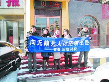昨日上午,沈陽一文化公司的5名員工在北三經(jīng)街鬧市區(qū)拉出條幅:“向無賴藝人討還演出費!”條幅下列出了三名藝人的姓名:齊秦、湯燦、孫悅。