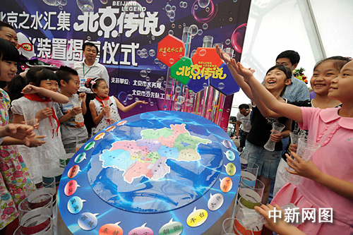 “北京之水匯集北京傳說”活動是圍繞北京兒藝六一大戲《北京傳說》中的節(jié)水環(huán)保主題而開展的、面向北京所有小學生及學齡前兒童的大型環(huán)保節(jié)水公益行動。現(xiàn)場12位節(jié)水小明星代表一起把他們從北京各水系取來的水標本匯集到“北京之水”大型環(huán)保容水裝置中,這一裝置高1.5米,它以藍色水波紋狀物體為底座,上方圓弧狀轉盤中用顯著顏色標識出北京水系分布情況,5月28日至6月1日《北京傳說》演出期間,該容器將放置在水立方場內,成為一道環(huán)保新景觀。