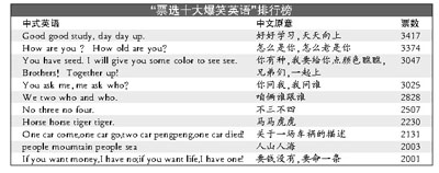 “票選十大爆笑英語”今晨出爐,“Goodgoodstudy,daydayup”(好好學(xué)習(xí),天天向上)以3417票高居榜首,成為最受歡迎的中式英語。