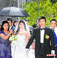 昨早9時(shí)男方以6輛奔馳車隊(duì)至女方家迎娶,親友幫新娘撐的卻是黑傘,依民間習(xí)俗,一般新娘出嫁時(shí),親友會以米篩遮陽,如果是撐黑傘,多半意味新娘腹中有喜。問新人是否有喜時(shí),他們只說“謝謝”,未正面回答。證婚人鳳凰衛(wèi)視主席劉長樂入場時(shí),被媒體問:“小孩是男的?女的?”他也未作答。