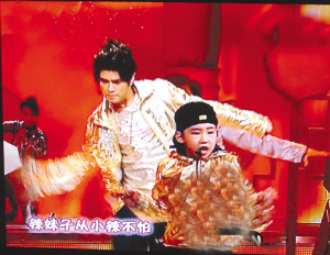 昨晚首次正式登場的周杰倫一身金色上場表演《本草綱目》時,并不是一個人在演唱,他還帶了個小朋友——一個與他同樣在RAP、HIPHOP舞步上很有表現(xiàn)力的男孩子,大男生帶小男生的組合贏得不少掌聲。
