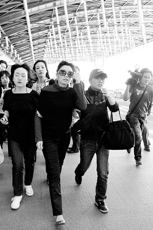 等賈靜雯一走出通道,媒體立即蜂擁而上。其內(nèi)地經(jīng)紀(jì)公司委派的兩名助理,立即上前將其左右護住。