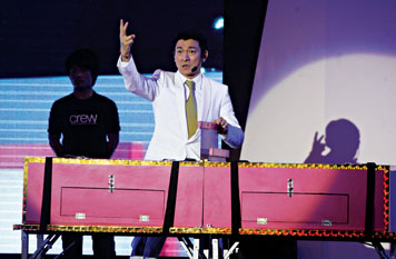 劉謙變魔術(shù),那是他的老本行,而劉德華就純粹是客串了,但在舞臺(tái)上的一招一式,劉德華倒并不業(yè)余。第一個(gè)魔術(shù)請(qǐng)出了他的“女朋友 ”:“她是我今天的女朋友哦!边呎f邊摸著美女的手,“為了公平起見,我要邀請(qǐng)媒體朋友一起來參與!薄斑有你,美女,我喜歡漂亮的……”還沒開始變魔術(shù),之前的噱頭已擺得夠足!皩⒚琅P(guān)在盒子里,用鋒利的刀等工具往下插,然后盒子分離,人也就此被分尸……”表演內(nèi)容并不陌生,但出自華仔之手,粉絲們看得津津有味,尖叫聲不斷!華仔究竟用了多少時(shí)間學(xué)會(huì)變這個(gè)魔術(shù)的呢?“這個(gè)是秘密,不能告訴你們!惫首魃衩氐娜A仔透露說,自己曾經(jīng)上過劉謙的節(jié)目,也跟他學(xué)了幾招。