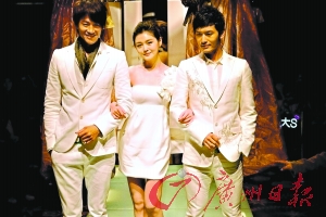 當(dāng)天,三位男女主角的現(xiàn)身方式十分特別。兩大帥哥黃曉明、何潤東伴在大S兩側(cè), 坐在輕紗籠罩的華麗纜車上,徐徐空降到透明T臺上。三位偶像各自賣力秀出迷人微笑,揮手向粉絲致意。超短裙搭超高銀色高跟鞋,大S挽著兩位帥哥走過透明T臺,享受著在座女性妒忌的眼光。