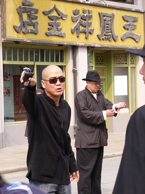 根據(jù)劇組的通告,昨日《建國大業(yè)》劇組從早晨6點30分就開工拍攝。當早報記者于中午時分趕到車墩時,導(dǎo)演黃建新正在“拍兩個不知名人士的戲份”,不見“蔣介石”的扮演者張國立,但劇組人員保證“張國立今天來了片場”。下午2點,劇組午休時間結(jié)束!澳暇┞贰鄙虾鋈欢喑隽艘蝗汉谝潞诿、幫派打扮的群眾演員。同時,一輛車輪外側(cè)被涂成金色的“另類”黃包車也出現(xiàn)在“南京路”的一頭。幾分鐘后,現(xiàn)場忽然一陣騷動,許多原本在附近休息的游客都涌向了“南京路”口,拿出相機拍個不停。原來是“杜月笙”馮小剛出現(xiàn)了。同時,還有一個光頭、戴著墨鏡、手執(zhí)大喇叭的男子,在給馮小剛以及現(xiàn)場的群眾演員安排走位。仔細一看,這位“現(xiàn)場導(dǎo)演”不是別人,正是“蔣介石”張國立。原來整個上午,張國立并沒有休息,而是呆在劇組在片場臨時設(shè)置的工作室內(nèi),和另一位導(dǎo)演韓三平一起,看之前拍攝的回放。
