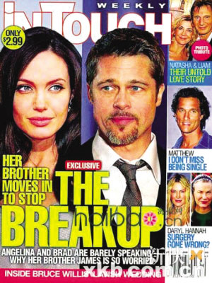 布拉德·皮特和安吉麗娜·朱莉的夢(mèng)幻愛(ài)情,似乎有幻滅的趨勢(shì)。最近,不止一家的美國(guó)雜志報(bào)道了兩人的感情危機(jī)。就連臺(tái)灣媒體也不甘示弱,報(bào)道中稱(chēng)布拉德·皮特、安吉麗娜·朱莉關(guān)系陷入冰點(diǎn),兩人協(xié)議暫時(shí)分居。假如情勢(shì)無(wú)法挽回,小布將爭(zhēng)取六名子女的監(jiān)護(hù)權(quán),另外,高達(dá)2億美元的財(cái)產(chǎn)分配問(wèn)題,恐怕也會(huì)讓這對(duì)“史密斯夫婦”展開(kāi)廝殺。