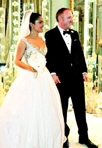 中新網(wǎng)4月29日電 女星薩爾瑪·海耶克與法國(guó)億萬富翁弗朗索瓦·昂利·皮諾特的婚紗照曝光。由于弗朗索瓦·昂利·皮諾特是時(shí)尚大亨,海耶克在婚禮上穿起自家品牌設(shè)計(jì)師Nicolas Ghesquiere打造的新娘禮服,艷光四射。