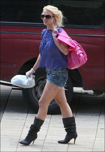 布蘭妮·斯皮爾斯在演唱會(huì)結(jié)束的休息之際,扮起了清純少女,藍(lán)色珍珠衫配超短熱褲,黑色靴子,艷粉色書包,如果小甜甜能再瘦一點(diǎn)的話,相信效果會(huì)更好。