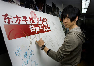由于活動(dòng)推遲了20分鐘,唐禹哲還未坐定,電話便響個(gè)不停,而唐禹哲來(lái)不及喝口水潤(rùn)喉便認(rèn)真地與FANS聊起來(lái)。聽(tīng)說(shuō)這位打進(jìn)電話的FANS,正是在前日簽售會(huì)上為自己送禮物的人,唐禹哲連連道謝,“我看到大家托你送的很大一包東西了,我很喜歡,我會(huì)帶回臺(tái)灣去的!甭(tīng)出FANS對(duì)他的話持著半信半疑的態(tài)度,唐禹哲又反復(fù)強(qiáng)調(diào),“我有拆開(kāi)來(lái)看過(guò),是玉和胸章對(duì)吧!”讓對(duì)方受寵若驚忍不住尖叫。