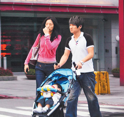 中新網(wǎng)4月14日電 臺(tái)灣“金曲歌王”曹格一家3口溫馨散步被拍,一個(gè)潮爸、一個(gè)酷媽?zhuān)值菍?duì)。曹格頂著紫色厚發(fā)推娃娃車(chē),樂(lè)當(dāng)奶爸。