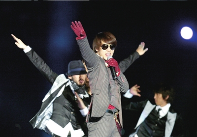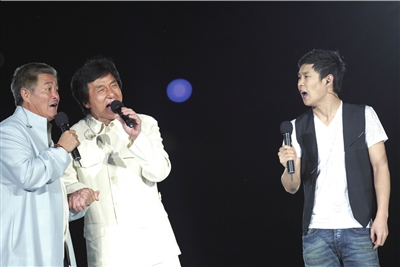 昨晚的演唱會嘉賓云集,舞臺設置也頗有陣勢,在中心舞臺的四周分設了6個舞臺。晚7點半,《龍的傳人》前奏響起,成龍身穿白衣?lián)趔镜菆觯c所有的演出嘉賓合唱一首《龍的傳人》。