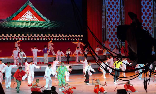 由河南少林塔溝武校表演的武術(shù)劇《功夫世家》,演員們不僅表演常規(guī)性的武術(shù),還有情節(jié)串聯(lián)其中,在昨日的彩排中備受好評。近20個不同年齡的演員組成一家人,手里拿著各種生活用品,拐杖、雞毛撣子等都被作為武器,每個人都能打上一段,中間還穿插了交誼舞、恰恰舞等元素,武術(shù)演員們搞笑的表演十分引人入勝,引得臺下觀眾大笑不止,雖然搞笑,但一看就知道是真功夫。節(jié)目的下半段,電視劇《李小龍傳奇》中李小龍的扮演者、香港演員陳國坤亮相,所有武術(shù)演員在陳國坤的帶領(lǐng)下,一起舞起了雙截棍,但因?yàn)殛悋な鞘状螀⒓哟和,所以顯得很緊張,動作十分不熟練,但隨后陳國坤漸漸找到了感覺,與演員的配合也默契了很多。整個節(jié)目的場面非常壯觀,氣勢逼人。與以往的武術(shù)節(jié)目相比,塔溝武校參加2009年央視春晚的節(jié)目在昨日的彩排中表現(xiàn)更加搶眼,使得在場的每一位觀眾都笑不籠嘴,甚至連鼓掌都忘記了,一直沉浸在詼諧、幽默的節(jié)目的氛圍之中。