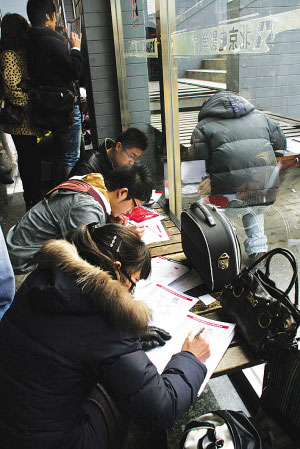 由于外地考生多,不少來報名的考生都是拖著行李直奔考場,所以一些賓館也來到學院門口吆喝。附近煎餅攤兒的老板也樂開了花,平時一天二三百元的買賣一下子翻番。記者 王瑜明