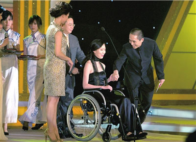 張藝謀、宋祖英為劉巖頒發(fā)“中國年度舞蹈最佳表現(xiàn)女演員獎”。劉巖坐著輪椅緩緩上臺時,張藝謀連忙跑過去幫扶。劉巖哽咽著說:“為了奧運,我們舞者獻出了所有力量,雖然最后我沒能演出,但是依然感到光榮!