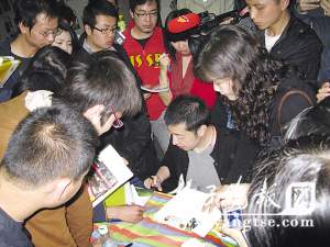記者發(fā)現(xiàn)一位男青年手里抱著一堆書,忙前忙后地見(jiàn)人就問(wèn),你是賈導(dǎo)的影迷嗎?他告訴記者,他叫徐鑫,是賈樟柯影迷聯(lián)盟的成員,在北京讀大學(xué)時(shí)就喜愛(ài)看賈導(dǎo)的電影,聯(lián)盟的成員委托他來(lái)南京幫著要簽名,“有陜西、山西,還有江蘇無(wú)錫、常州的,這些書是幫他們簽的! 徐鑫說(shuō),他此次來(lái)還有一個(gè)任務(wù),就是發(fā)展成員。“聯(lián)盟剛剛成立不久,只有七八十人,今天收獲不小,至少有40多人表示愿意加入!庇浾邌(wèn)他對(duì)現(xiàn)場(chǎng)火爆的情形怎么看,他認(rèn)為,不排除有些大學(xué)生根本就沒(méi)看過(guò)賈導(dǎo)的電影和書,是來(lái)趕熱鬧的,把他當(dāng)成了偶像。