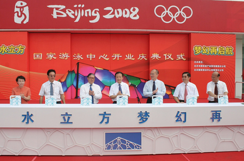 北京市副市長(zhǎng)程紅在慶典中致辭。北京市委常委、統(tǒng)戰(zhàn)部部長(zhǎng)牛有成宣布“國(guó)家游泳中心完成賽后改造,現(xiàn)重新對(duì)外開放”。隨后,中央及北京市有關(guān)領(lǐng)導(dǎo)、捐資人代表共同為水立方開啟“全新水立方 夢(mèng)幻再啟航”的大門,水立方以嶄新的形象展現(xiàn)在社會(huì)公眾面前。參加慶典的領(lǐng)導(dǎo)隨后參觀了水立方場(chǎng)館,并出席了在水立方內(nèi)舉辦的“港澳臺(tái)同胞海外華僑華人支持北京2008奧運(yùn)會(huì)紀(jì)念展揭幕儀式”。