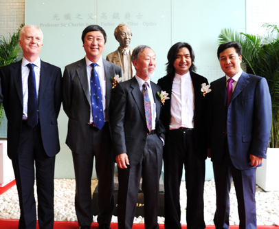 中新網(wǎng)9月29日電 據(jù)寧夏僑聯(lián)消息,9月27日,香港中文大學(xué)舉行了高錕雕像揭幕典禮,由諾貝爾物理學(xué)獎(jiǎng)高錕伉儷、校長(zhǎng)沈祖堯教授及著名雕塑家吳為山教授主禮,中國(guó)僑聯(lián)副主席朱奕龍應(yīng)邀參加揭幕儀式,與中大校領(lǐng)導(dǎo)、教授以及人文學(xué)者等師生代表近百余人共襄盛舉。