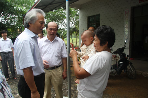 吳士存一行首先赴文昌華僑農(nóng)場進行慰問,認真聽取了農(nóng)場的災情匯報,實地察看了農(nóng)場農(nóng)作物及魚塘受災情況,慰問了生活困難的職工,深入受災職工家中與受災群眾親切交談,了解職工的實際困難。所到之處,吳士存關(guān)切的詢問受災群眾是否有糧吃、有菜吃、有水喝,今年農(nóng)場農(nóng)作物和魚塘收入受到影響有多大,生活上還有什么困難需要解決。吳士存還和職工們聊起了退水后如何進行災后重建和開展生產(chǎn)自救工作,并語重心長的鼓勵大家要振作精神,艱苦奮斗、同舟共濟、共度難關(guān)。