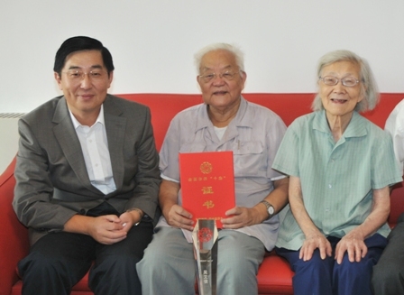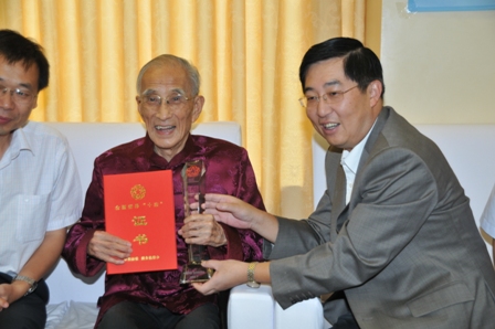 喬衛(wèi)向兩位院士介紹了中國(guó)僑聯(lián)組織及與國(guó)務(wù)院僑辦聯(lián)合開(kāi)展“全國(guó)僑界十杰”評(píng)獎(jiǎng)的情況,仔細(xì)詢(xún)問(wèn)他們的工作生活和健康狀況。喬衛(wèi)代表中國(guó)僑聯(lián)向吳文俊院士和顏鳴皋院士頒發(fā)了“全國(guó)僑界十杰”獎(jiǎng)杯和證書(shū),并祝愿兩位院士健康長(zhǎng)壽,生活愉快。