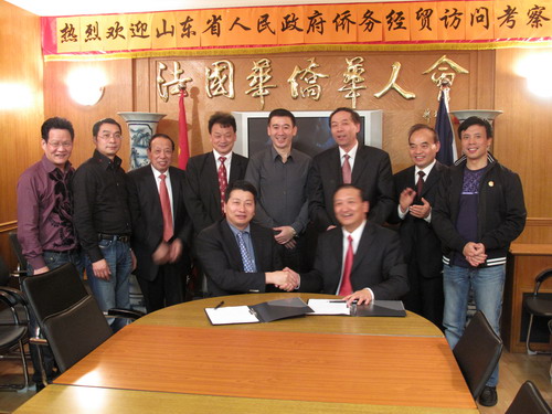 雙方一致同意,今后進一步加強信息交流,互相支持,開展實質(zhì)性合作。山東省海外交流協(xié)會副會長史進與華僑華人會會長陳勝武在友好關(guān)系協(xié)議書上簽字。