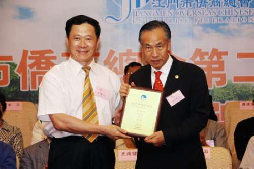 王南健等向新當(dāng)選的理事會成員頒發(fā)了證書。廣東省僑辦副主任陳仰豪對僑商總會成立三年來所取得的成績和自身發(fā)展給予充分肯定。江門市委副書記譚繼祖代表市委、市政府對僑商總會和廣大僑商為江門市經(jīng)濟社會發(fā)展所做出的貢獻表示衷心感謝;并指出,市僑商總會自成立以來,秉承“為會員服務(wù)、為經(jīng)濟建設(shè)服務(wù)、為社會服務(wù)”的宗旨,在加強內(nèi)外溝通、以商引商、應(yīng)對國際金融危機、為僑資企業(yè)排憂解難、支持僑鄉(xiāng)慈善公益事業(yè)等方面,做出了大量卓有成效的工作,衷心希望僑商總會與各位僑商朋友繼續(xù)大力宣傳推介江門的投資環(huán)境,吸引更多的僑商到江門投資興業(yè)和經(jīng)貿(mào)洽談。