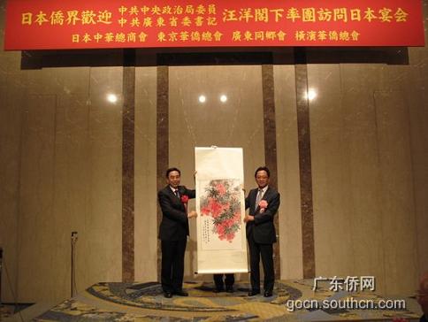 日本中華總商會會長嚴(yán)浩代表宴會主辦單位向廣東省代表團(tuán)贈送了紀(jì)念品,廣東省委常委、廣州市委書記朱小丹向宴會主辦單位回贈了國畫《紅荔》。廣東省外辦、省外經(jīng)貿(mào)廳等省直有關(guān)單位及有關(guān)市領(lǐng)導(dǎo)也出席了當(dāng)晚的歡迎晚宴。(陳雪婷)