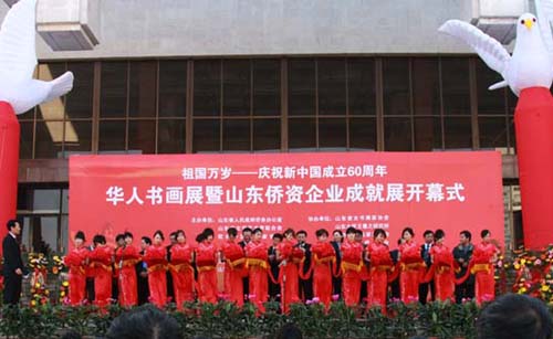 中新網11月10日電 據山東省僑辦消息,“祖國萬歲——慶祝新中國成立60周年華人書畫展暨山東僑資企業(yè)成就展”大型宣傳展覽活動11月6日在濟南拉開帷幕。國務院僑辦副主任馬儒沛、省政協副主席李德強、著名書畫家劉寶純出席活動開幕式并為活動剪彩。省僑辦主任王琳在開幕式上致辭,省僑辦黨組書記朱緒平主持開幕式。