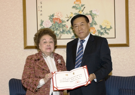 會(huì)見時(shí),林軍向陳香梅女士頒發(fā)中國(guó)僑聯(lián)顧問聘書。