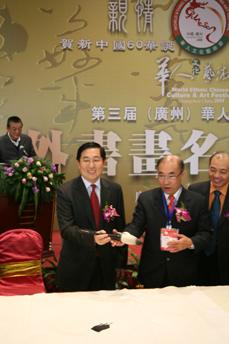 此次海內(nèi)外書(shū)畫(huà)名家聯(lián)誼筆會(huì)是正在廣州召開(kāi)的第三屆(廣州)華人文化藝術(shù)節(jié)的活動(dòng)之一。梁世雄、連登等大陸書(shū)畫(huà)界一批著名書(shū)畫(huà)家,以及來(lái)自美國(guó)、澳大利亞、香港的蔡天濤、黎明等書(shū)畫(huà)家應(yīng)邀參會(huì)。中國(guó)僑聯(lián)副主席喬衛(wèi)為聯(lián)誼筆會(huì)開(kāi)筆。