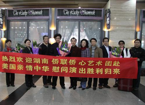 中新網(wǎng)2月11日電 據(jù)湖南省僑聯(lián)消息,經(jīng)湖南省政府批準,由湖南省僑聯(lián)組團,湖南省僑聯(lián)、長沙市外事僑務辦公室、長沙市僑聯(lián)、開福區(qū)僑聯(lián)主辦,應美國有關僑(社)團的邀請,湖南省僑聯(lián)僑心藝術團于2010年1月23至2月8日,在紐約、洛杉磯、華盛頓、休斯敦、圣安東尼奧等城市“親情中華”赴美慰問巡演,圓滿成功,于2月9日載譽平安歸來。