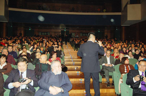 接著,由空軍政治部文工團(tuán)組成的“親情中華”藝術(shù)團(tuán)的藝術(shù)家們?yōu)榇蠹冶硌萘司实奈膴使?jié)目,龐妮娜和楊帥表演的舞蹈令觀眾耳目一新,特別是他們所表現(xiàn)出來(lái)的扎實(shí)的基本功令在場(chǎng)的意大利觀眾驚嘆不已;當(dāng)田毅走上觀眾席,“真朋友”的歌聲在每個(gè)人的身邊響起時(shí),懂中文的觀眾向意大利友人傳遞著友情。梁召今獨(dú)唱的意大利語(yǔ)民歌“我的太陽(yáng)”一曲震驚全場(chǎng),掌聲如雷。