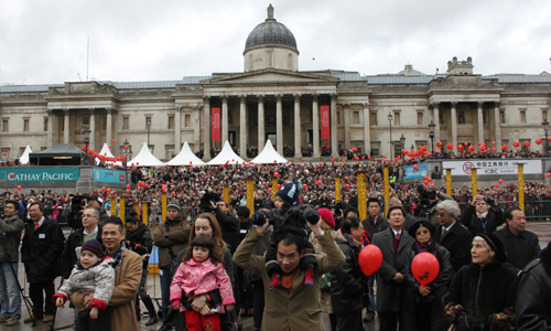 中新網(wǎng)2月22日電 2月21日中午,近三十萬英國華僑華人及當(dāng)?shù)孛癖妳R集在倫敦特拉法加廣場,共同觀賞了由中國國務(wù)院僑辦副主任任啟亮率領(lǐng)的“文化中國•四海同春”藝術(shù)團的精彩演出。中央民族歌舞團極具民族特色的歌舞和著名歌唱家劉斌、呂薇、桐瑤的傾情表演深深地打動了數(shù)以十萬計的觀眾,使廣大旅英僑胞在春寒料峭中感受到了來自祖(籍)國的溫暖,也使在場的外國朋友領(lǐng)略到中華文化的魅力。