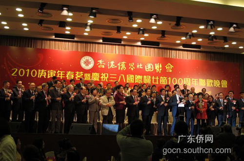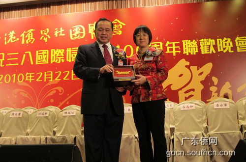 中新網2月26日電 據廣東僑網消息,2月22日晚,香港龍堡國際賓館冠蓋云集,群賢匯聚。香港僑界社團聯(lián)會在此隆重舉行2010庚寅年春茗暨慶祝三八國際婦女節(jié)100周年聯(lián)歡晚會。廣東省僑辦副主任黎靜出席此次活動,并向該會贈送禮品。