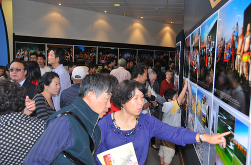 演出前,“文化中國(guó)•四海同春”大洋洲藝術(shù)團(tuán)團(tuán)長(zhǎng)、國(guó)務(wù)院僑辦副主任趙陽在劇場(chǎng)外大廳為《中華民族全家!穲D片展剪彩。一幅幅圖片展示著中國(guó)56個(gè)民族多姿多彩的文化生活;匠莾S胞們或駐足欣賞,或興奮地向周邊朋友細(xì)說自己在中國(guó)的所見所聞。