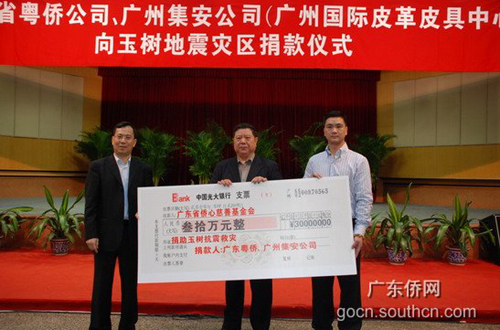 4月24日上午,簡樸熱烈的捐款儀式在廣東省僑辦二樓禮堂舉行。廣東省粵僑企業(yè)總公司黨委書記、總經(jīng)理詹奕群和廣州溫州商會會長、廣州集安投資有限公司董事長朱清國,向廣東省僑辦副主任、省僑心慈善基金會榮譽主席朱爾武遞交了30萬元救災捐款支票。廣東省僑辦副巡視員、省僑心慈善基金會監(jiān)事長董華民主持捐贈儀式并講話,他充分肯定了粵僑企業(yè)總公司、集安投資有限公司履行社會責任,積極參與賑災濟困,為國分憂、為民紓難的善舉。據(jù)悉,這筆善款將經(jīng)由廣東省慈善總會盡快匯往玉樹災區(qū)。