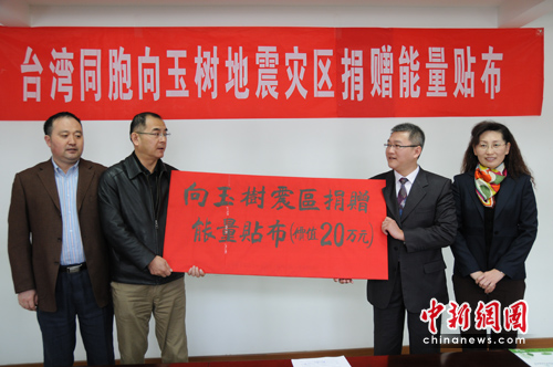 中新網北京4月28日電(記者 張冬冬)臺灣通德興業(yè)股份公司董事長陳前芳28日在此間向中國華僑經濟文化基金會捐贈價值20萬元人民幣的能量貼布,用以支援青海玉樹抗震救災。