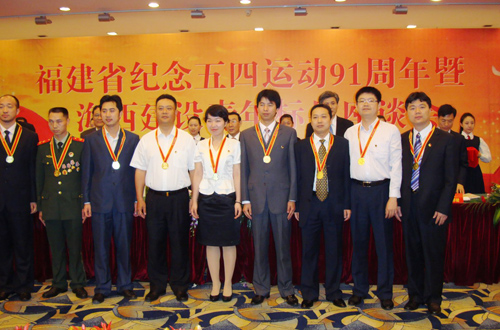 中新網(wǎng)5月6日電 據(jù)思明區(qū)僑聯(lián)消息,5月4日上午,在福建省紀(jì)念五四運(yùn)動(dòng)91周年暨海西建設(shè)青年標(biāo)兵座談會(huì)上,福建省廈門市思明區(qū)僑聯(lián)青委會(huì)會(huì)長(zhǎng)、廈門鷺達(dá)眼鏡有限公司董事長(zhǎng)、高級(jí)經(jīng)濟(jì)師張和輝榮獲由中共福建省委組織部、福建省公務(wù)員局(福建省人力資源開(kāi)發(fā)辦公室)、共青團(tuán)福建省委聯(lián)合頒發(fā)的第七屆“福建青年五四獎(jiǎng)?wù)隆薄?table border=0 cellspacing=0 cellpadding=0 align=left>