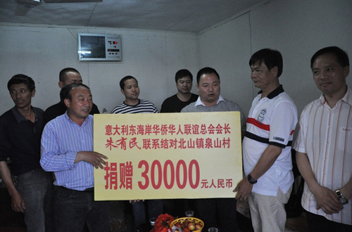 中新網(wǎng)5月28日電 據(jù)青田縣僑聯(lián)消息,5月26日,浙江省青田縣委常委、縣委辦公室主任楊雷陪同青田籍華僑、意大利東海岸華僑華人聯(lián)誼總會(huì)會(huì)長(zhǎng)朱有民,來(lái)到聯(lián)系其結(jié)對(duì)的北山鎮(zhèn)肖山村和泉山村,分別向兩村各捐贈(zèng)3萬(wàn)元共計(jì)6萬(wàn)元,用于改善村莊的基礎(chǔ)設(shè)施建設(shè)。