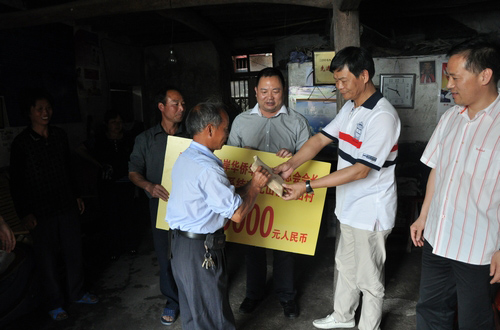 楊雷、朱有民一行人先后來(lái)到兩村,跟村兩委人員親切交談,了解村里的基本情況。肖山村全村800多人,有160多人留守在家,村民們主要收入來(lái)源就是稻田養(yǎng)魚和油茶培育。而泉山村全村也就70多戶村民,經(jīng)濟(jì)來(lái)源單一,生活生產(chǎn)困難。座談會(huì)上,村干部們就如何發(fā)展該村經(jīng)濟(jì)效益而暢所欲言,同時(shí)也提出了由于地處偏遠(yuǎn),經(jīng)濟(jì)發(fā)展不起來(lái),資金不足而導(dǎo)致至今沒有一幢像樣的村委大樓等困難和問題。朱有民在了解情況后,毫不猶疑地向兩村各捐贈(zèng)了3萬(wàn)元人民幣,用于村委大樓的建設(shè),并表示以后村里如果有問題和困難,他都會(huì)一直關(guān)注和支持的。